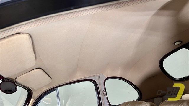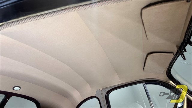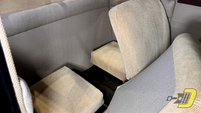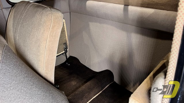 The tan interior has also been redone and remains in wonderful condition. It still has the factory style split front bench seat and rear jump seats. Note the 2-spoke steering wheel along with the Deluxe-only dual visors and ashtrays. The lights, horn, wipers, and parking brake all work properly as do the fuel, oil pressure, and water temperature gauges. The ammeter and clock are just for looking at though. This example has also been fitted with turn signals which take the place of the parking lights in front.